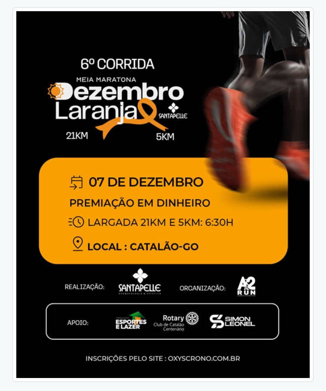 Com o apoio do Rotary Club de Catalão-Centenário a Clínica Santapella estará realizando a 6ª Corrida Dezembro Laranja. Esta será a primeira vez que Catalão receberá uma prova de Meia Maratona.