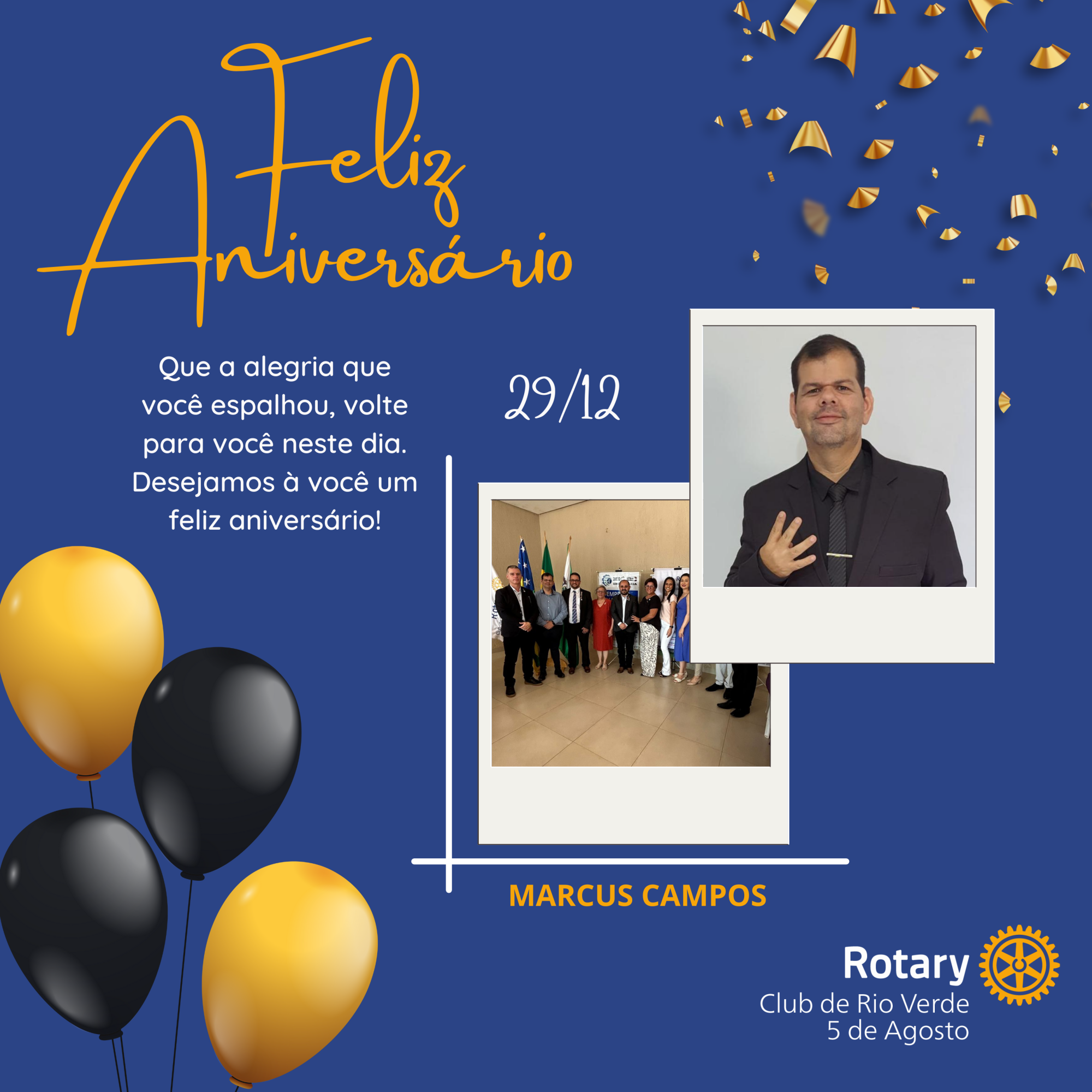 Companheiro Marcus Campos, todos os associados do Rotary Club de Rio Verde 5 de Agosto o cumprimentam pelo seu aniversário, desejando-lhe muita saúde, alegrias, e as bençãos de Deus em sua vida.