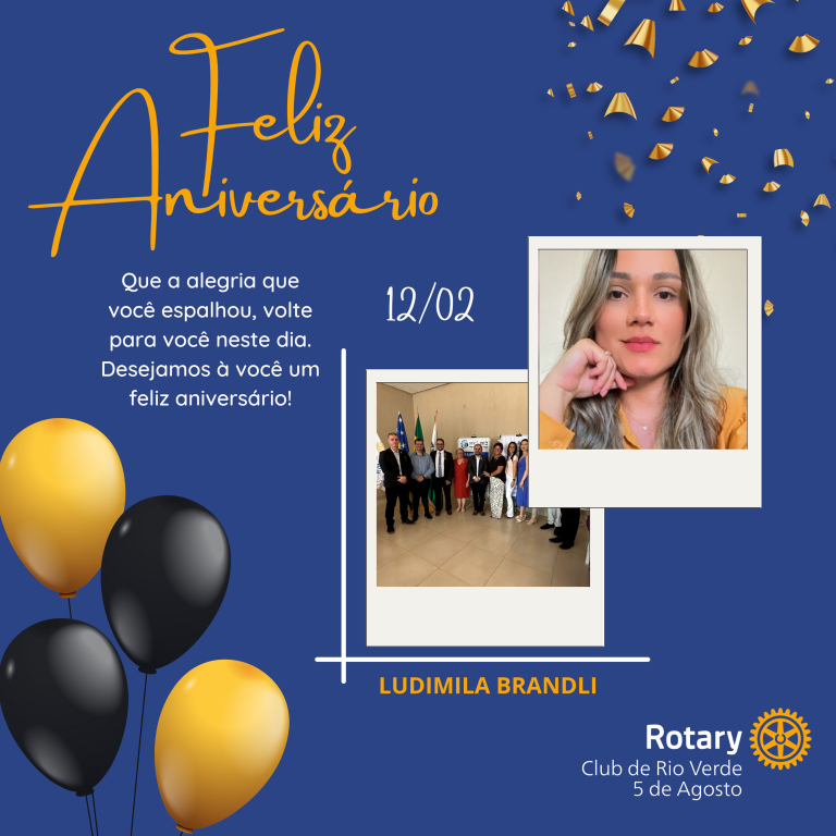 Companheira Ludimila Brandli, todos os associados do Rotary Club de Rio Verde 5 de Agosto a cumprimentam pelo seu aniversário, desejando-lhe muita saúde, alegrias, e as bençãos de Deus em sua vida.