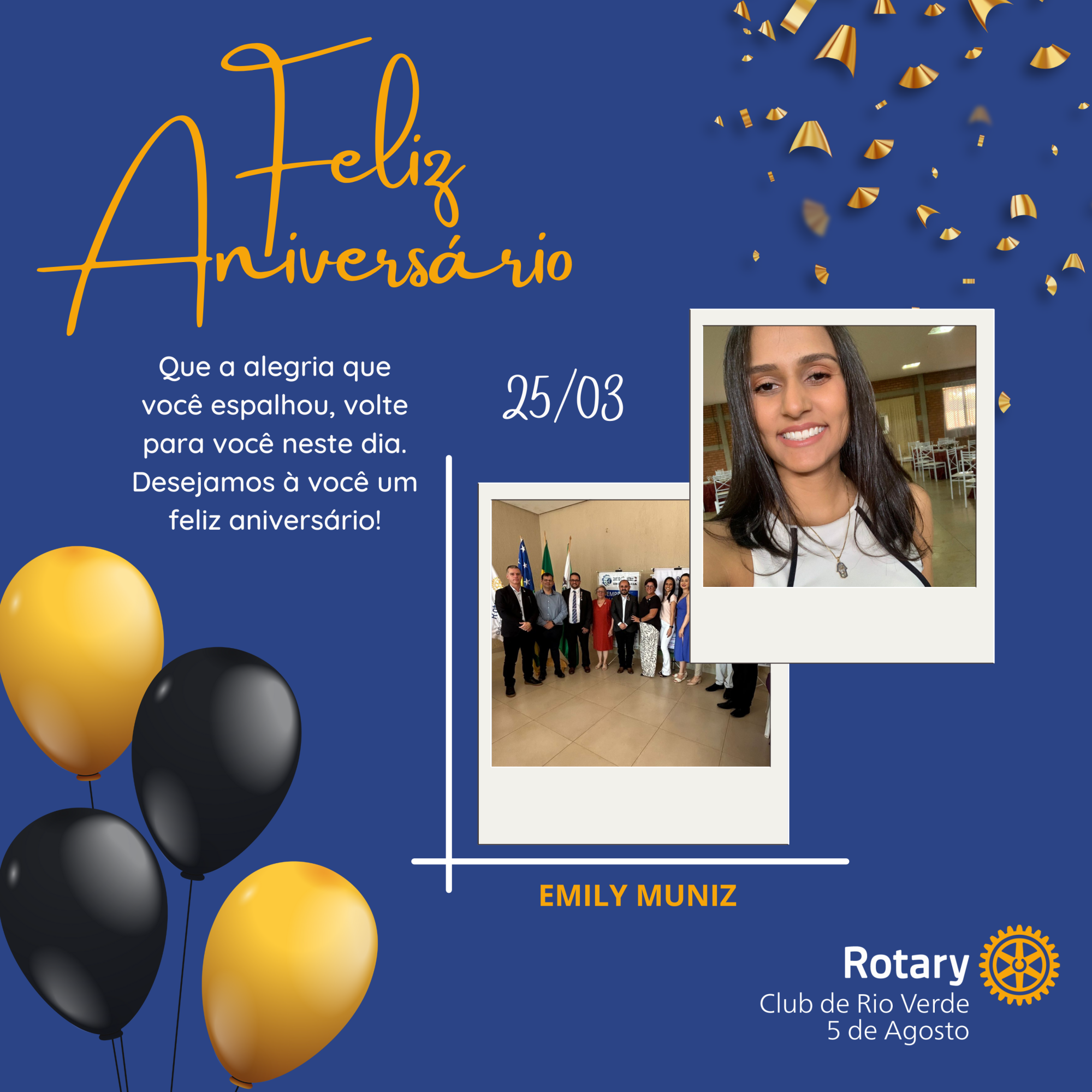 Companheira Emily Muniz, todos os associados do Rotary Club de Rio Verde 5 de Agosto a cumprimentam pelo seu aniversário, desejando-lhe muita saúde, alegrias, e as bençãos de Deus em sua vida.