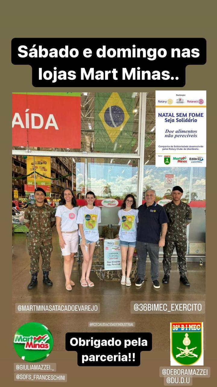 Nos dias 08 e 09 de dezembro, a Família Rotaria de Uberlândia, realizou a Ação "Natal Sem Fome", nas quatro unidades do MartMinas de nossa cidade. Mais uma vez, contamos com o apoio logístico e presencial do nosso glorioso Exército Brasileiro, especificamente do nosso 36 BIMec o "Sentinela do Triangulo", comandado pelo Ten Cel Barroso Magno.