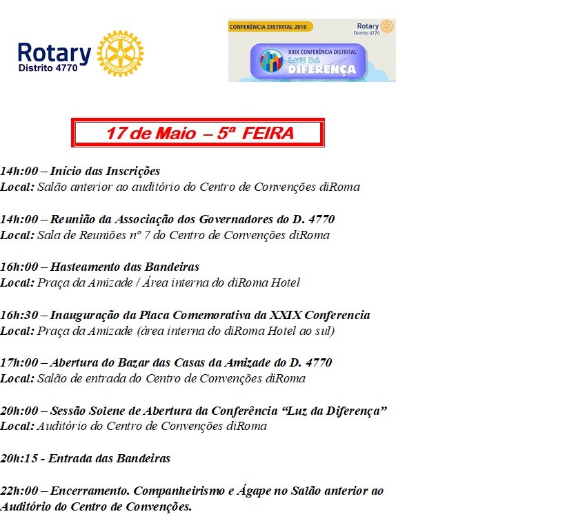 Caros Companheiros e Companheiros. Esse é o resumo da Programação da nossa Conferência Luz da Diferença, que ocorrerá do dia 17 a 20 de Maio de 2018 no Thermas Di Roma, na cidade de Caldas Novas. Ela ainda não foi impressa, porém se houver ainda pequenos ajustes eles serão corrigidos antes da impressão. Essa versão da Programação é apenas para divulgação interna dos rotarianos toda a familia rotária.