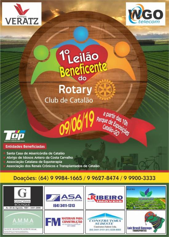 Com objetivo de ajudar as famílias mais carentes de Catalão, através de instituições sem fins lucrativos, o Rotary Club de Catalão vai realizar o 1º Leilão Beneficente. O evento está marcado para o dia 9 de junho, domingo, e será realizado no Parque de Exposições de Catalão.