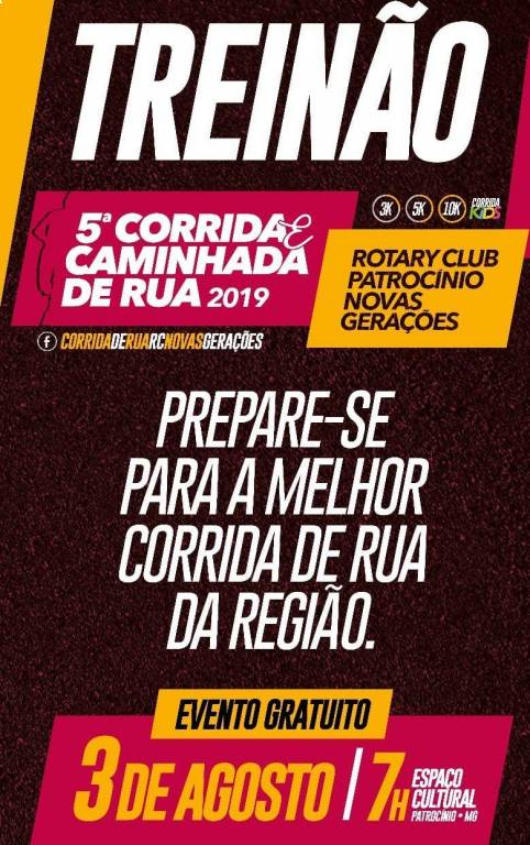 Neste sábado dia 03 de agosto de 2019 as 7:00 horas o Rotary Club De Patrocinio Novas Gerações realizou no Espaço Cultural da cidade de Patrocinio-MG o treinão visando a preparação dos atletas para 5º corrida de rua que acontecerá no dia 1 º de setembro. O evento foi gratuito e contou com a participação de vários atletas e associados do referido Rotary.